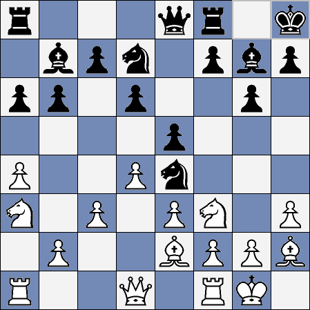 1.d4 Cf6 2.Cf3 g6 3.Af4 d6 4.e3 Ag7 5.Ae2 O-O 6.h3 b6 7.O-O Ab7 8.c3 Cbd7 9.a4 a6 10.Cbd2 De8 11.Ah2 e5 12.Cc4 Ce4 13.Ca3 Rh8